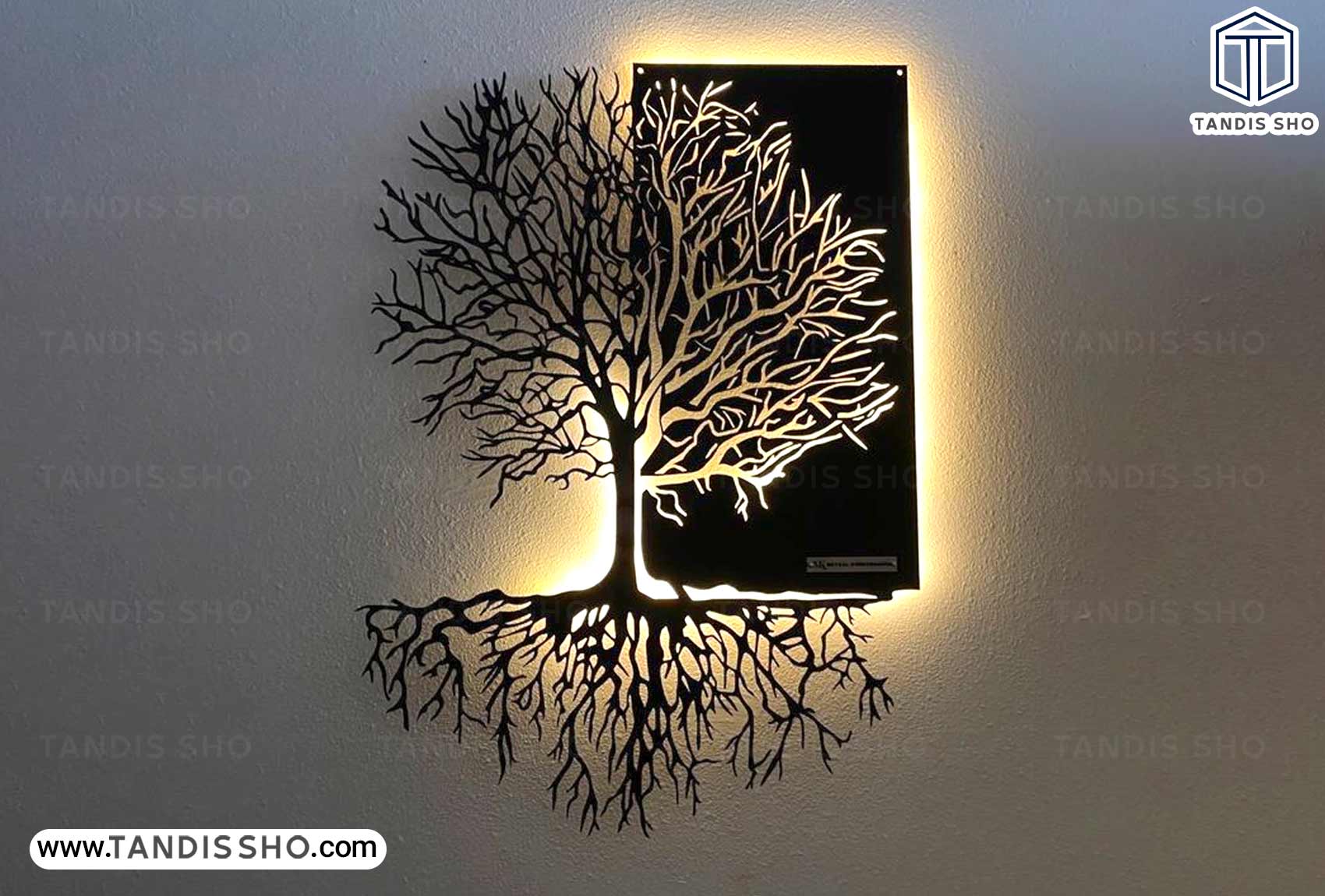 تابلو دیواری درخت با نمایش شاخهها و ریشهها، همراه با نورپردازی مخفی پشت تابلو، جلوهای متفاوت به دیوار میدهد و مناسب دکوراسیون مدرن و هنری است.