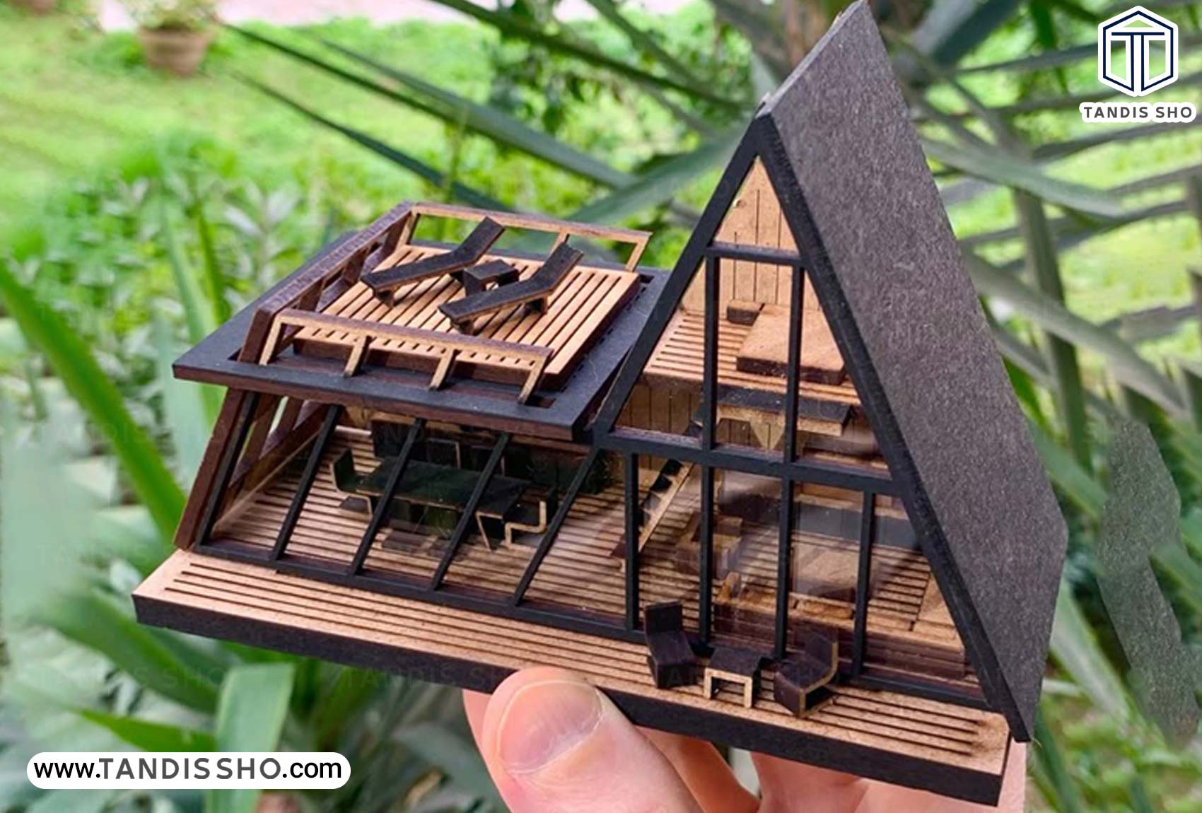 ماکت معماری طرح خانه تمام شیشهای از چوب و شیشه ساخته شده و با بالکن، تراس و بخشهای مختلف، جلوهای واقعی و جمعوجور از خانههای تفریحی ارائه میدهد.